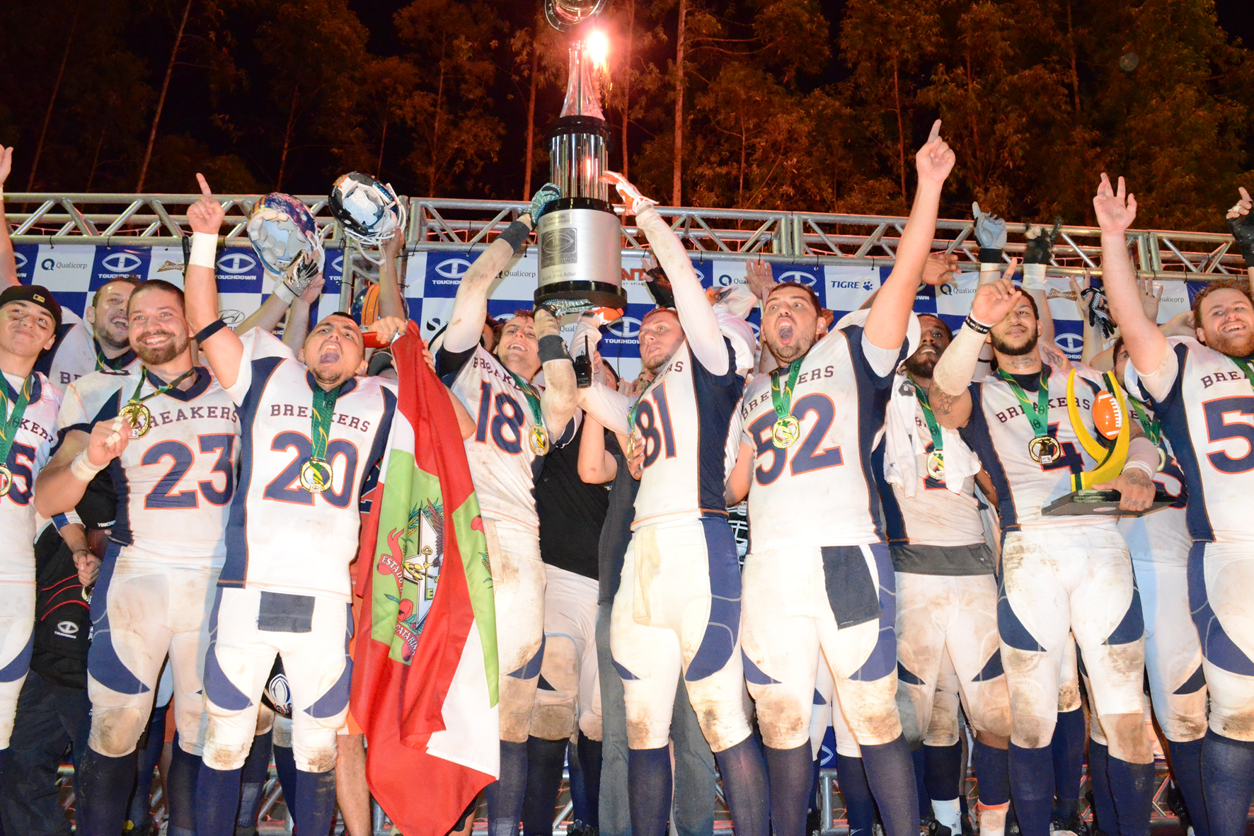 O estádio explode. A emoção é única. O ponto extra é convertido. O placar passa a marcar 15 a 11. E o Jaraguá Breakers é o novo campeão do Brasil.